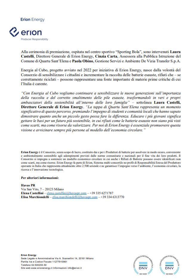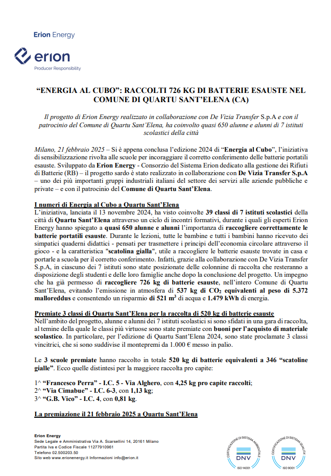 “ENERGIA AL CUBO”: RACCOLTI 726 KG DI BATTERIE ESAUSTE NEL COMUNE DI QUARTU SANT’ELENA (CA)